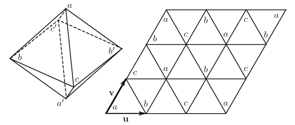 . The planar development of the octahedron is a bit trickier: we tile the plane as in figure 3, however each vertex on the plane may represent a vertex or it’s opposite vertex on the octahedron e.g.